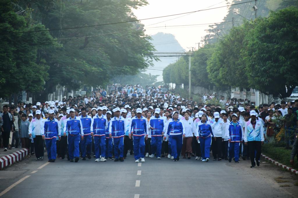 ဦးစွာ ပြည်နယ်ဝန်ကြီးချုပ်၊ ပြည်နယ်အမျိုးသမီးရေးရာအဖွဲ့နာယက၊ ပြည်နယ်တရားလွှတ်တော်တရားသူကြီး ချုပ်၊ ပြည်နယ်အစိုးရအဖွဲ့ဝင်များ၊ ဌာနဆိုင်ရာများ၊ တက္ကသိုလ်၊ ဒီဂရီကောလိပ်၊ သိပ္ပံများနှင့် အခြေခံပညာကျောင်းများမှ ကျောင်းသား၊ကျောင်းသူ၊ဆရာ၊ဆရာမများ၊ မြို့ပေါ်ရပ်ကွက်နေပြည်သူများ စုစုပေါင်း ၂၁၀၀ ဦးခန့်သည် စုရပ်ဖြစ်သော သီရိလမ်း၊ ဝန်ကြီးများအိမ်ရာရှေ့မှ သီရိလမ်းအတိုင်း၊ ဆေးရုံလမ်း၊ ကျော်ဇေယျလမ်း၊ မာန်းနဲစန်လမ်း၊ အထက(၄) ကျောင်းလမ်းမှတစ်ဆင့် သီရိလမ်းအတိုင်း သီရိကွင်းအတွင်းသို့ ပျော်ရွှင်စွာစုပေါင်းလမ်းလျှောက်ခဲ့ကြပြီး သီရိကွင်း အတွင်း၌ အကြောလျှော့လေ့ကျင့်ခန်းများစုပေါင်းဆောင်ရွက်၍ ကိုယ်လက်ကြံ့ခိုင်ရေးလေ့ကျင့်ခန်း အစီအစဉ် အတွဲ အမှတ်(၁)နှင့် အမှတ်(၂) တို့ကို စုပေါင်းဆောင်ရွက်ခဲ့ကြသည်။