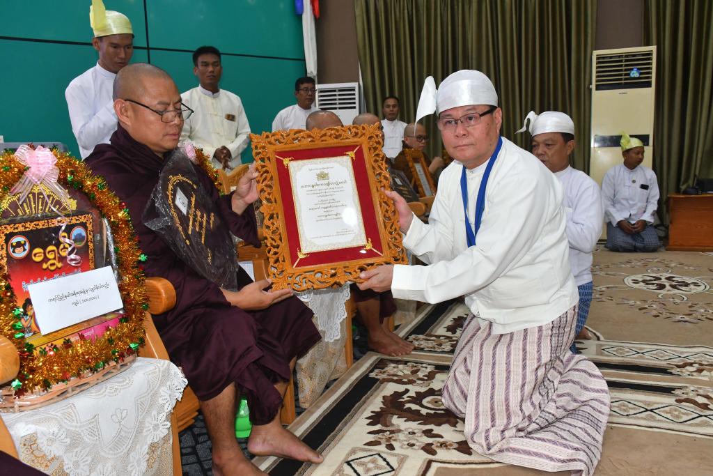 ယင်းနောက် ပြည်နယ်ဝန်ကြီးချုပ်က သာသနာရေးဆိုင်ရာများကို လျှောက်ထားတင်ပြပြီး ပြည်နယ်ဝန်ကြီးချုပ်၊ ပြည်နယ်တရားလွှတ်တော်တရားသူကြီးချုပ်၊ ပြည်နယ်ဝန်ကြီးများက အထူးပင့်သံဃာတော်များအား လှူဖွယ်ဝတ္ထုပစ္စည်း များနှင့်နဝကမ္မအလှူငွေများဆက်ကပ်လှူဒါန်းကြကာ ပြည်နယ်ဝန်ကြီးချုပ်က မဟာဂန္ထဝါစကပဏ္ဍိတဘွဲ့တော်ရ ဘားအံ မြို့၊ အမှတ်(၃)ရပ်ကွက်၊ ဓမ္မပီယစာသင်တိုက်ဆရာတော်ဘဒ္ဒန္တခေမိဿရာလင်္ကာရအားလည်းကောင်း၊ ပြည်နယ်တရား လွှတ်တော်တရားသူကြီးချုပ်က မဟာသဒ္ဓမ္မဇောတိကဓဇဘွဲ့တော်ရ ဘားအံမြို့၊ အမှတ်(၉)ရပ်ကွက်၊ လောကအတုလ မာရ်အောင်တောရကျောင်းတိုက် ဆရာတော်ဘဒ္ဒန္တသောဘိတ အား လည်းကောင်း၊ လုံခြုံရေးနှင့်နယ်စပ်ရေးရာဝန်ကြီးက မဟာသဒ္ဓမ္မဇောတိကဓဇ ဘွဲ့တော်ရ မြဝတီမြို့၊ အမှတ်(၄)ရပ်ကွက်၊ ဓမ္မရောင်ခြည်ပရိယတ္တိစာသင်တိုက်ဆရာတော် ဒေါက်တာဘဒ္ဒန္တဓမ္မပါလအားလည်းကောင်း၊ စီးပွားရေးရာဝန်ကြီးက ဂန္ထဝါစကပဏ္ဍိတဘွဲ့တော်ရ ဘားအံမြို့နယ်၊ သံလှယ် စံပြကျေးရွာ၊ ရာမညနိကာယစာသင်တိုက်ဆရာတော်ဒေါက်တာဘဒ္ဒန္တဉာဏိဿရ အားလည်းကောင်း၊ သယံဇာတရေးရာ ဝန်ကြီးက သဒ္ဓမ္မဇောတိကဓဇဘွဲ့တော်ရ ဘားအံမြို့နယ်၊ ကော့လမုကျေးရွာ၊ ကော့လမုကမ်းနားကျောင်းတိုက်ဆရာတော် ဘဒ္ဒန္တပဏ္ဍိတအားလည်းကောင်း၊လူမှုရေးရာဝန်ကြီးက သဒ္ဓမ္မဇောတိကဓဇဘွဲ့တော်ရ လှိုင်းဘွဲမြို့နယ်၊အမှတ်(၅)ရပ်ကွက်၊ အထက်ပိုင်ကျုံကျောင်းသစ်ကျောင်းတိုက်ဆရာတော်ဘဒ္ဒန္တဝေပုလ္လအားလည်းကောင်း၊ လမ်းပန်းဆက်သွယ်ရေးဝန်ကြီး က ကမ္မဋ္ဌာနစရိယဘွဲ့တော်ရ မြဝတီမြို့၊အမှတ်(၅)ရပ်ကွက်၊ထေရဝါဒဗောဓိရိပ်သာကျောင်းဆရာတော် ဘဒ္ဒန္တဓမ္မဒဿီ အားလည်းကောင်း၊ ပြည်နယ်အမျိုးသမီးရေးရာအဖွဲ့နှင့် မိခင်နှင့်ကလေးစောင့်ရှောက်မှူကြီးကြပ်ရေးအဖွဲ့ နာယက ဒေါ်နန်းဘေဘီမြင့်က ဂန္ထဝါစကပဏ္ဍိတဘွဲ့တော်ရ ဘားအံမြို့၊ တောင်ကလေးကျေးရွာ၊ တောင်ကလေးပရိယတ္တိကျောင်း သီလရှင်ဆရာကြီး ဒေါ်ဉာဏသိင်္ဂီအား ဘွဲ့တံဆိပ်တော်၊ အဆောင်အယောင်နှင့်လှူဖွယ်ဝတ္ထုပစ္စည်းများကို ဆက်ကပ်လှူ ဒါန်းခဲ့ကြကာ စေတနာရှင်အလှူရှင်များက ဆရာတော်၊သံဃာတော်များအား လှူဖွယ်ဝတ္ထုပစ္စည်းများနှင့်နဝကမ္မ အလှူငွေများ ဆက်ကပ်လှူဒါန်းခဲ့ကြသည်။