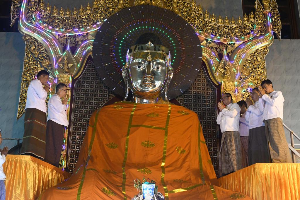 ထို့နောက် ပြည်နယ်ဝန်ကြီးချုပ်၊ ပြည်နယ်တရားလွှတ်တော်တရားသူကြီးနှင့်ပြည်နယ်အစိုးရအဖွဲ့ဝင်များက ဆရာတော်ကြီးများအားလှူဖွယ်ဝတ္ထုပစ္စည်းများဆက်ကပ်လှူဒါန်းကြပြီး ပြည်နယ်ဝန်ကြီးချုပ်နှင့်အစိုးရအဖွဲ့ဝင်များက မသိုးသင်္ကန်းဆက်ကပ်လှူဒါန်းနိုင်ရေး ပြည်နယ်သံဃနာယကအဖွဲ့(မူလဒွါရ)အမိတာရာမရဲကျောင်းဆရာတော် အဂ္ဂမဟာ ဂန္တဝါစကပဏ္ဍိတဘဒ္ဒန္တဂုဏလင်္ကာရက ဗုဒ္ဓဿဒေမ စသောဂါထာကို ရွတ်ဆိုတိုင်ကြားပေးပြီး ပြည်နယ်ဝန်ကြီးချုပ်၊ ပြည်နယ်တရားလွှတ်တော်တရားသူကြီးချုပ်၊ အစိုးရအဖွဲ့ဝင်များ၊ ဂေါပကအဖွဲ့နှင့် ဥပသကာတာဝန်ရှိသူများက သေဋ္ဌမာရ်အောင်ဘုရားကြီးအား မသိုးသင်္ကန်းဆက်ကပ်လှူဒါန်းကြရာ ဩဝါဒါစရိယဆရာတော်ကြီးများက ဇယေန္တော ဗောဓိယာမူလေ အစချီသော အောင်ဂါထာများကို ရွတ်ဖတ်ပူဇော်ပေးကြသည်။