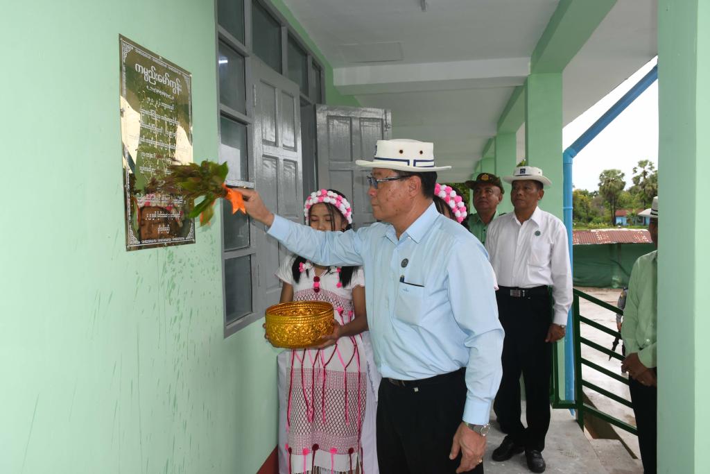 ယင်းနောက် ကျောင်းဆောင်သစ်လွှဲပြောင်းပေးအပ်ပွဲကို အဆိုပါကျောင်းခန်းမ၌ဆက်လက်ကျင်းပရာ ပြည်နယ် ဝန်ကြီးချုပ်က ပညာရေးဌာနအနေဖြင့် ယခုကျောင်းဆောင်သစ်ကြီးအတွင်း စာရေးခုံများ၊ ပရိဘောဂများ ဖြည့်ဆည်း ဆောင်ရွက်ပေးထားသည်ကိုတွေ့ရှိရပြီး ရေရှည်တည်တံ့ကောင်းမွန်ရန်နှင့် ကျောင်းဝန်းကျင်အစဉ်သန့်ရှင်းသာယာလှပစေ ရန် လက်ရှိကျောင်းတွင် တာဝန်ထမ်းဆောင်နေသူများက ထိန်းသိမ်းစောင့်ရှောက်ပေးကြရမည်ကြောင်း၊ ယနေ့အခမ်း အနားသို့ တက်ရောက်လာကြသောကျောင်းကော်မတီများ၊ အကျိုးတော်ဆောင်များ၊ မိဘများအနေဖြင့် မိမိတို့၏သား၊ သမီးပညာသင်ကြားခွင့်ကိုလမ်းကြောင်းအမှန်သို့ရောက်ရှိအောင် တိုက်တွန်းလမ်းညွှန်ပေးကြရန်နှင့် ဆရာ၊ဆရာမများ အနေဖြင့်လည်း ပညာရည်ထူးချွန်ပြီး နိုင်ငံအတွက်အားထားရသည့်သားကောင်းသမီးမွန်တပည့်ကောင်းများပေါ်ထွက်လာ အောင်သင်ကြားပေးကြစေလိုကြောင်း ပြောကြားသည်။