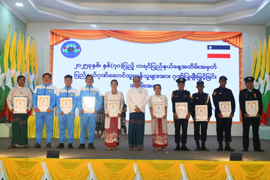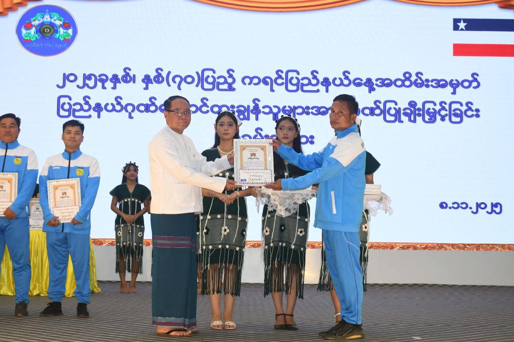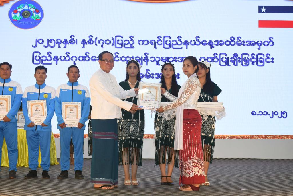 ထို့နောက် ပြည်နယ်ဝန်ကြီးချုပ်၊ ပြည်နယ်အမျိုးသမီးရေးရာအဖွဲ့နှင့်မိခင်နှင့်ကလေးစောင့်ရှောက်မှုကြီးကြပ်ရေး အဖွဲ့နာယက၊ ပြည်နယ်တရားလွှတ်တော်တရားသူကြီးချုပ်၊ ပြည်နယ်အစိုးရအဖွဲ့ဝင်များနှင့်ဌာနဆိုင်ရာတာဝန်ရှိသူများက နိုင်ငံ့ဂုဏ်ဆောင်နိုင်သူများ၊ ပြည်နယ်ဂုဏ်ဆောင်နိုင်သူများအတွက် ဂုဏ်ပြုဆု၊ ပြည်နယ်အတွင်းလုပ်ငန်းရှင်များအတွက် ကုန်သွယ်လုပ်ငန်းခွန်အများဆုံးထမ်းဆောင်သည့်ဆု၊ ဝင်ငွေခွန်အများဆုံးထမ်းဆောင်သည့်ဆု၊ အထူးကုန်စည်ခွန်အများ ဆုံးထမ်းဆောင်သည့်ဆု၊ ပြည်နယ်ဂုဏ်ကိုဆောင်နိုင်ခဲ့သည့် နိုင်ငံတော်အဆင့် ဆောင်းပါးများ၊ စာစီစာကုံးများတွင်ထူးချွန် ဆုရရှိသူများကိုချီးမြှင့်သည့်ဆု၊ ၂၀၂၅ ခုနှစ် တက္ကသိုလ်ဝင်စာမေးပွဲတွင်အောင်ချက်ကောင်းသောကျောင်းနှင့်မြို့နယ်၊ အမှတ်အများဆုံးရရှိသည့်ကျောင်းသား/ကျောင်းသူများဂုဏ်ပြုချီးမြှင့်သည့်ဆု၊ ဌာနဆိုင်ရာများမှ သက်ဆိုင်ရာသင်တန်း များတွင် ထူးချွန်ဝန်ထမ်းများအားချီးမြှင့်သည့်ဆု၊ စိုက်ပျိုးရေးတောင်သူထူးချွန်ဆု၊ မွေးမြူရေးတောင်သူထူးချွန်ဆု၊ အားကစားထူးချွန်ဆု၊ ကြက်ခြေနီထူးချွန်ဆု၊ နိုင်ငံတော်မှကြီးမှူးကျင်းပသည့်(၂၆)ကြိမ်မြောက် အဆို၊အက၊အရေး၊ အတီး ပြိုင်ပွဲတွင် ဆုရရှိသူများအား ဂုဏ်ပြုချီးမြှင့်သည့်ဆု၊ ပြည်နယ်နေ့အထိမ်းအမှတ် ဌာနဆိုင်ရာ၊ တက္ကသိုလ်၊ ဒီဂရီကောလိပ် နှင့် စက်မှုလက်မှုပြခန်းများအသိပညာပေးပြခန်းများတွင် အကောင်းဆုံးဆောင်ရွက်ခဲ့သည့်ပြခန်းဆု အစရှိသည့် ဆုပေါင်း ၁၅၇ ဆုကို ဂုဏ်ပြုချီးမြှင့်ပေးခဲ့ကြသည်။