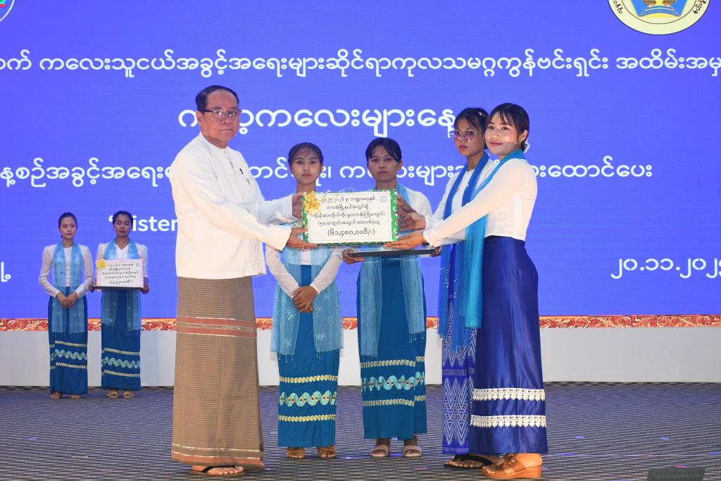 ထို့နောက် ပြည်နယ်ဝန်ကြီးချုပ်က ဘားအံမြို့နယ်အတွင်းရှိ ကိုယ့်အားကိုယ်ကိုးမူလတန်းကြိုကျောင်း(၅၈) ကျောင်းအတွက် တာဝန်ခံဆရာ၊ဆရာမများအားထောက်ပံ့ကြေး၊ သင်ထောက်ကူပစ္စည်းဖိုးငွေအပါအဝင် တစ်ကျောင်းလျှင် ငွေကျပ်(၁၀)သိန်း(၆)သောင်းနှုန်းဖြင့် စုစုပေါင်းငွေကျပ် ခြောက်ရာတစ်ဆယ့်လေးသိန်းရှစ်သောင်းကျပ်ကိုလည်းကောင်း၊ ပြည်နယ်အမျိုးသမီးရေးရာအဖွဲ့နှင့်မိခင်နှင့်ကလေးစောင့်ရှောက်မှုကြီးကြပ်ရေးအဖွဲ့နာယက က လှိုင်းဘွဲမြို့နယ်အတွင်းရှိ ကိုယ့်အားကိုယ်ကိုးမူလတန်းကြိုကျောင်း(၄၂)ကျောင်းအတွက် ငွေကျပ် လေးရာလေးဆယ့်ငါးသိန်းနှစ်သောင်းကျပ်ကို လည်းကောင်း၊ ပြည်နယ်တရားလွှတ်တော်တရားသူကြီးချုပ်ဦးညွန့်လင်းက ကော့ကရိတ်မြို့နယ်ရှိကိုယ့်အားကိုယ်ကိုး မူလတန်းကြိုကျောင်း(၁၃)ကျောင်းအတွက် ငွေကျပ်တစ်ရာသုံးဆယ်ခုနှစ်သိန်းရှစ်သောင်းကျပ်ကိုလည်းကောင်း၊ ပြည် နယ်အစိုးရအဖွဲ့ဝင်များက မြဝတီမြို့နယ်အတွင်းရှိ ကိုယ့်အားကိုယ်ကိုးမူလတန်းကြိုကျောင်း(၂)ကျောင်းအတွက် ငွေကျပ် နှစ်ဆယ့်တစ်သိန်းနှစ်သောင်းကျပ်ကိုလည်းကောင်း၊ သံတောင်ကြီးမြို့နယ်ရှိ ကိုယ့်အားကိုယ်ကိုးမူလတန်းကြိုကျောင်း (၂)ကျောင်းအတွက် ငွေကျပ် နှစ်ဆယ့်တစ်သိန်းနှစ်သောင်းကျပ်ကိုလည်းကောင်း၊ ကြာအင်းဆိပ်ကြီးမြို့နယ်ရှိ ကိုယ့်အား ကိုယ်ကိုးမူလတန်းကြိုကျောင်း(၂)ကျောင်းအတွက် ငွေကျပ်နှစ်ဆယ့်တစ်သိန်းနှစ်သောင်းကျပ်ကိုလည်းကောင်း စုစုပေါင်း ကျောင်းပေါင်း(၁၁၉)ကျောင်းအတွက် ငွေကျပ် တစ်ထောင်နှစ်ရာခြောက်ဆယ့်တစ်သိန်းလေးသောင်းကျပ်ကို အသီးသီး ပေးအပ်ချီးမြှင့်ခဲ့ကြသည်။
