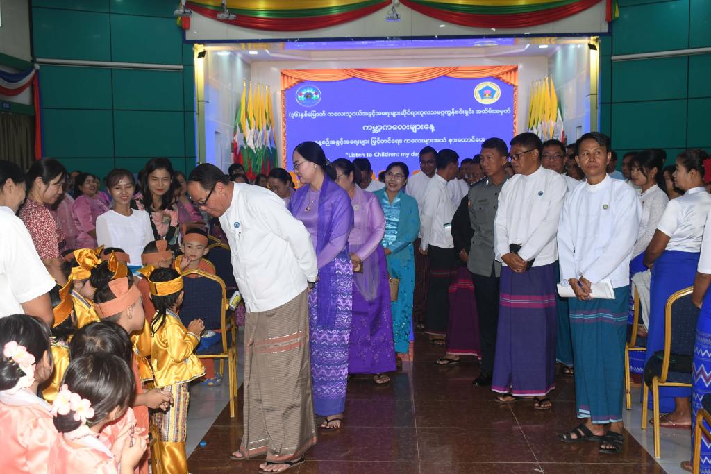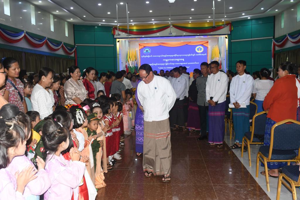 ဦးစွာ ပြည်နယ်ဝန်ကြီးချုပ်ဦးစောမြင့်ဦးက ကလေးသူငယ်များအတွက် ကဏ္ဍစုံဖွံ့ဖြိုး တိုးတက်ရေး၊ ကာကွယ် စောင့်ရှောက်ရေးလုပ်ငန်းများဆောင်ရွက်သည့်အခါ ကလေးများ၏အသံကိုနားထောင်ပြီး ပကတိ လိုအပ်ချက်များအပေါ် အခြေခံကာ အားလုံးပူးပေါင်းဆောင်ရွက်ပေးကြစေလိုကြောင်း တိုက်တွန်းပြောကြားသည်။