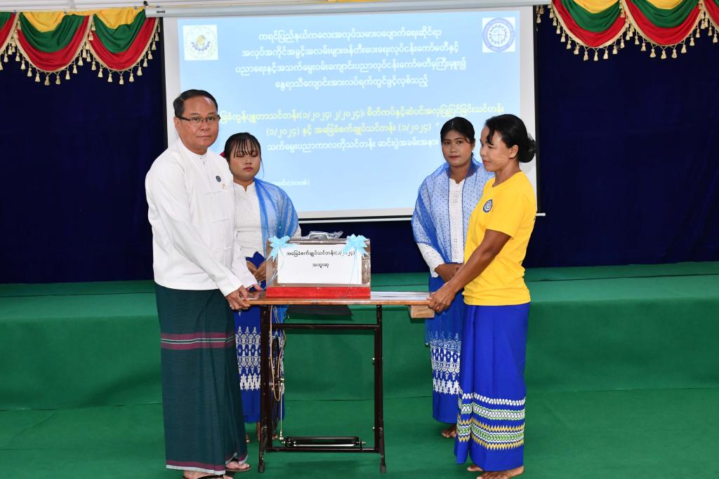 ထို့နောက် ပြည်နယ်ဝန်ကြီးချုပ်က အခြေခံစက်ချုပ်သင်တန်း(၁/၂၀၂၄)တွင် အထူးဆုရရှိသူတစ်ဦးအား ခြေနင်းအပ်ချုပ်စက်တစ်လုံးနှင့်ဆက်စပ်ပစ္စည်းများနှင့် သင်တန်းများတွင် ထူးချွန်ပထမဆုရရှိသူများကိုလည်းကောင်း၊ ပြည်နယ်အစိုးရအဖွဲ့ဝင်များက သင်တန်းထူးချွန် ဒုတိယ၊ တတိယနှင့် သင်တန်းဆင်းအောင်လက်မှတ်များကိုလည်း ကောင်း အသီးသီးပေးအပ်ချီးမြှင့်ကြရာ သင်တန်းဆင်းသင်တန်းသူတစ်ဦးက ကျေးဇူးတင်စကားပြန်လည်ပြောကြား သည်။
